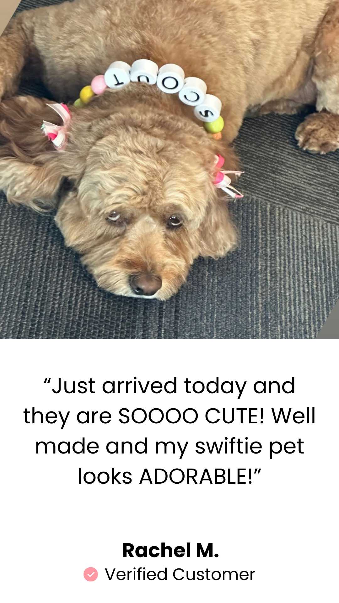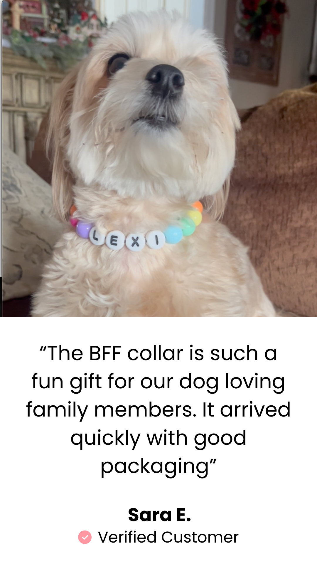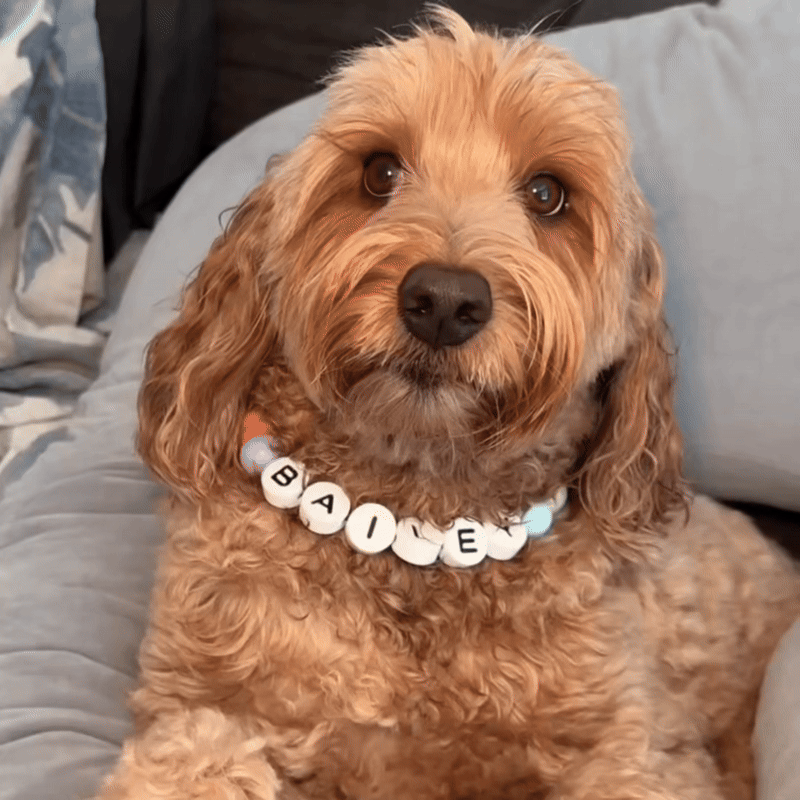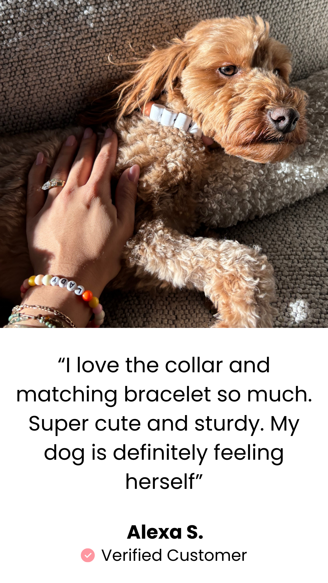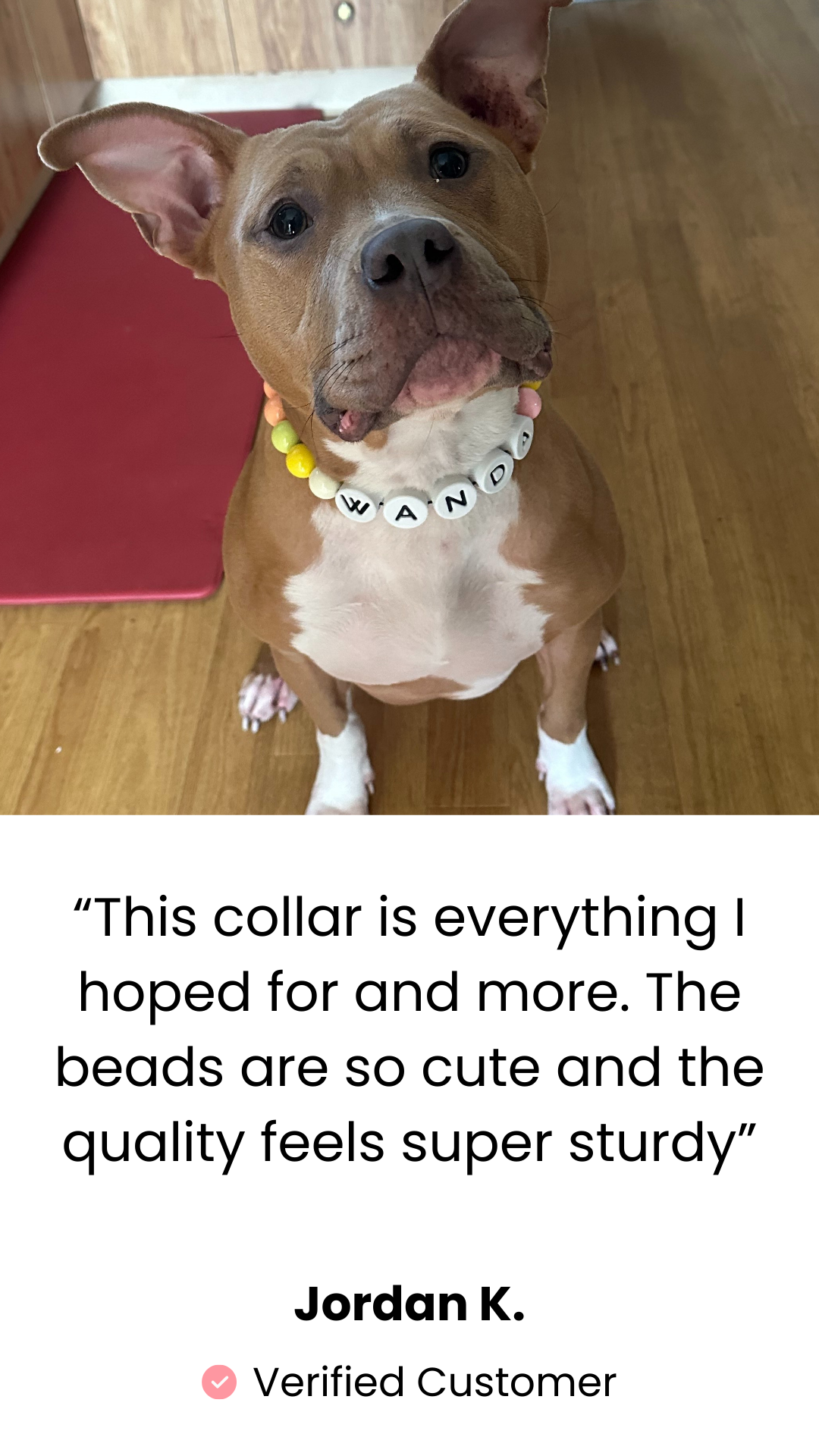 Each collar is handmade with custom letter beads to spell out their name, nickname, or whatever you call them when no one’s around. It’s more than a collar — it’s theirs.